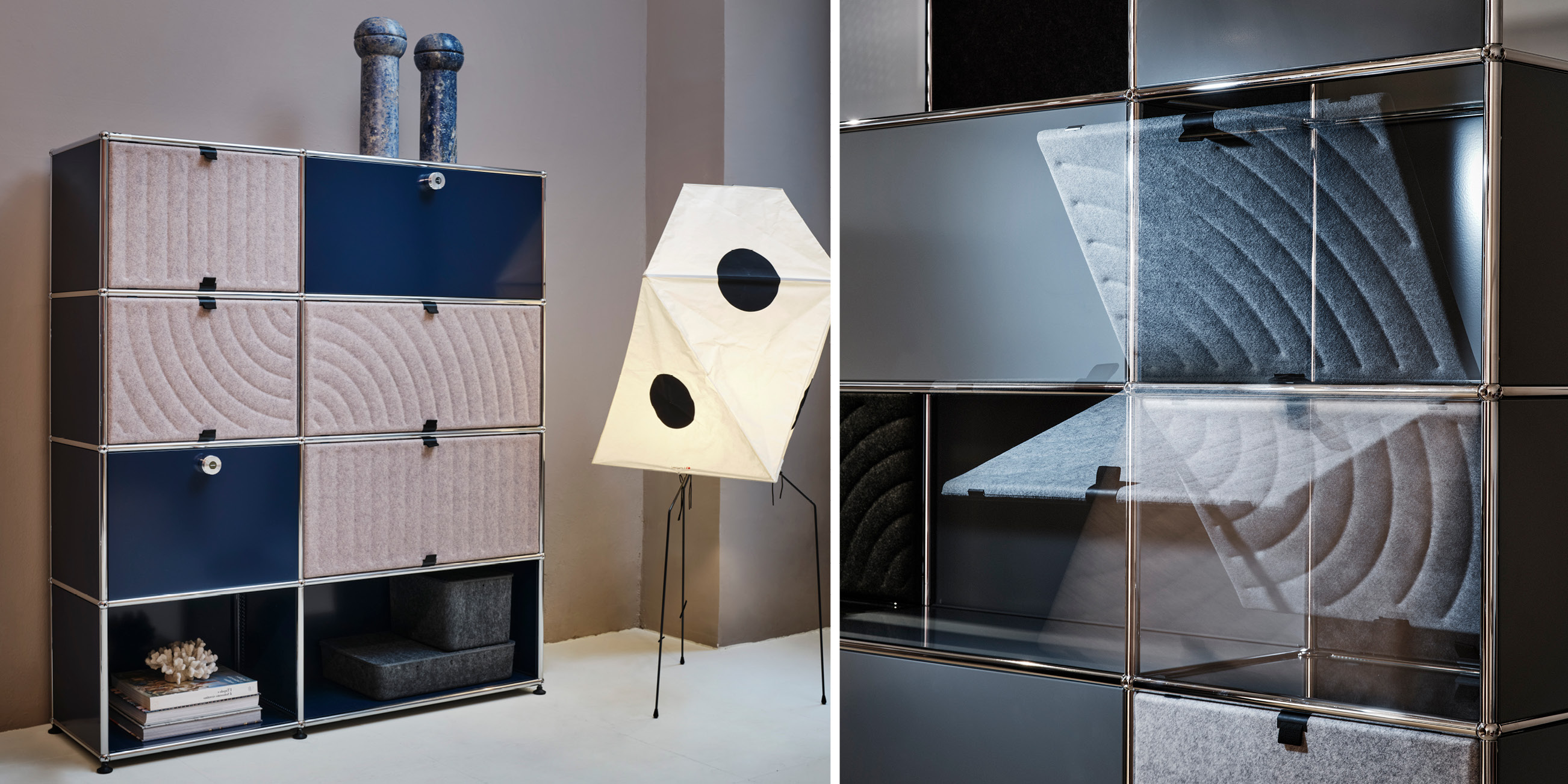 Dank integrierter Magnete lassen sich die Soft Panels mühelos in die Rohrstruktur einklicken – ganz ohne Werkzeug. Sie können flexibel aufgeklappt, verschoben oder neu positioniert werden und machen Veränderung so einfach wie nie zuvor. Playful, soft, easy: USM zeigt einmal mehr, wie zeitloses Design mit innovativen Ideen weitergedacht wird.