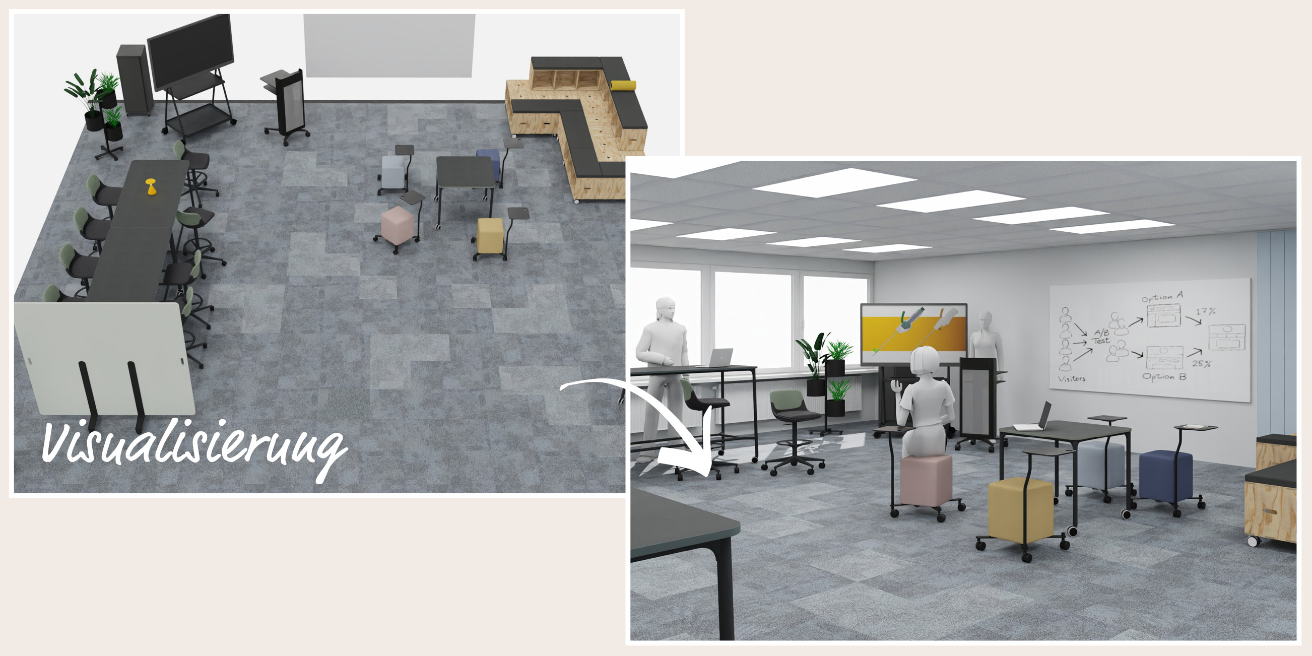 Gemeinsam mit Ihnen entwickeln wir Schritt für Schritt Ihre zukünftige Arbeitswelt – von der ersten Idee bis zur klaren Vision. Auf dieser Basis erstellen wir realitätsnahe Visualisierungen, die zeigen, wie Ihre Räume wirken, funktionieren und sich anfühlen werden. Dabei berücksichtigen wir unterschiedliche Varianten in Gestaltung, Möblierung und Anordnung.