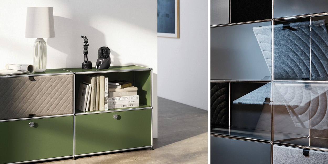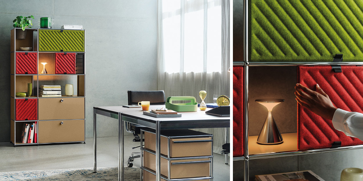 Das neue USM Haller Soft Panel ergänzt die Produktpalette von USM um eine weiche und spielerische Note. Die textilen Panels sind mit vier Magneten versehen und lassen sich ganz einfach in die Rohrstruktur des Möbelbausystems klicken – ohne Montageaufwand oder zusätzliche Vorrichtung. Genauso locker lassen sie sich nach oben oder unten aufklappen und in das nächste Fach flippen. Der Magnetismus sorgt für ein ganz neues Erlebnis: playful, soft, easy.